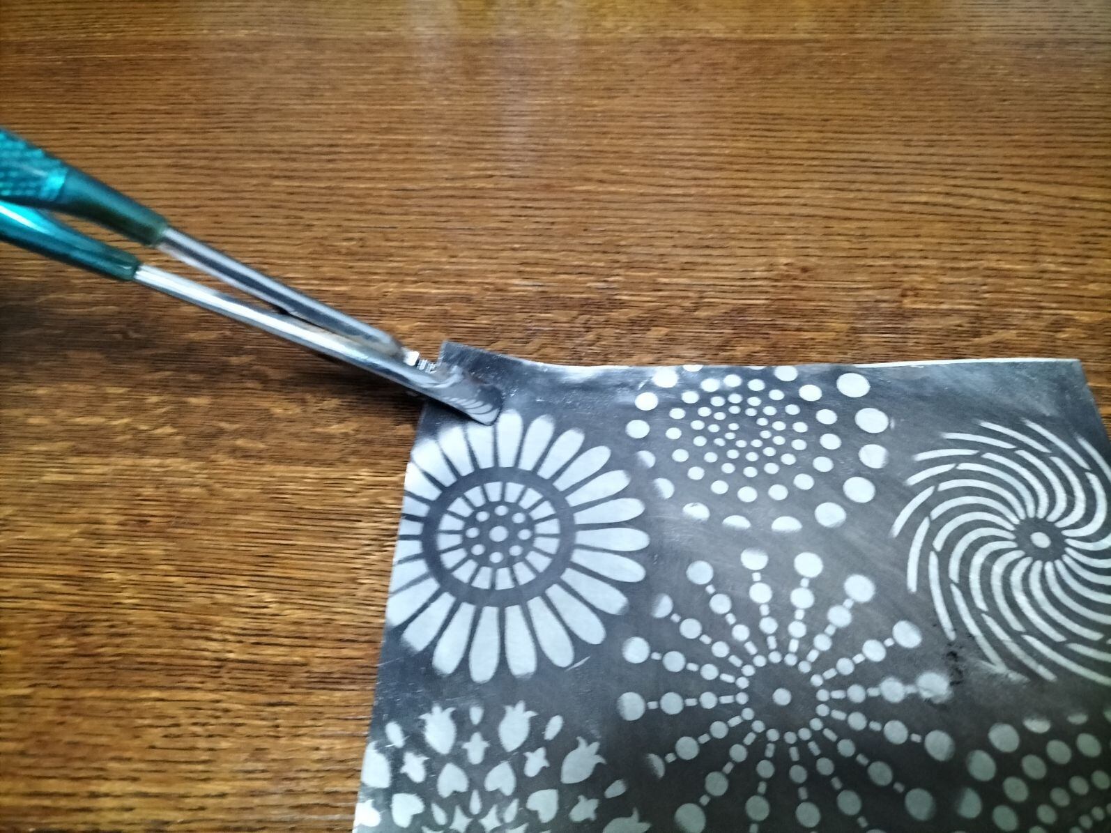 本品をペンチなどで四辺や四隅を曲げていただくと、お好きな形のお皿になります。曲げを戻すこともできますが、完全には元に戻りません。適度な波打った変形が味わいとなります。四隅を45°につまむと深皿になります。極端な曲げ、引っ張り、プレスは破断の原因になりますのでお避け下さい。けがをしないよう軍手着用の上器具にて曲げてください。